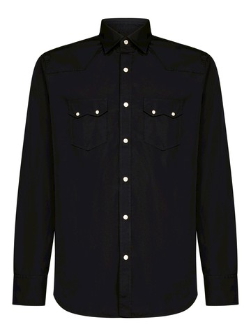 Front snap buttons closure, flower logo embroidered on the placket Pointed collar; Long sleeves, snap button cuffs Two chest patch pockets with flap and snap buttons closure Western yoke Regular fit Black color 100% Cotton Made in Italy Item in photo corresponds to a 41 Neck. Mannequin size: 48 IT. Mannequin measures: Height 1.85 cm, Bust/Breast 94cm, Waist 75cm, Shoulder 44cm, Neck 43cm, Hip Bone 93cm, Arm lenght 62cm, Breast level 26cm, Knee level 63cm, Wrist circumference 20cm