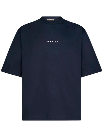 Ribbed crewneck Short sleeves; Straight hem White logo print on the chest Boxy fit Color: Midnight Blue 100% Cotton Made in Portugal The item in the photo corresponds to a 48 IT size. Mannequin size: 48 IT. Mannequin Measurements: Height 1.85cm, Bust/Chest 95cm, Waist 75cm, Shoulder 44cm, Neck 43cm, Pelvis 93cm, Arm Length 62cm, Chest Level 26cm, Knee Level 63cm, Wrist Circumference 20cm
