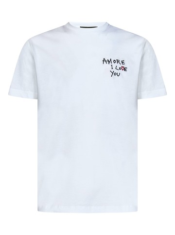 Ribbed crewneck; Short sleeves Contrasting "AMORE I LOVE YOU" embroidery at chest; Contrasting "DSQUARED2" lettering embroidered at back Straight hem Slim fit White color 100% Cotton Made in Italy Item in photo corresponds to a M. Mannequin size: 48 IT. Mannequin measures: Height 1.85 cm, Bust/Breast 94cm, Waist 75cm, Shoulder 44cm, Neck 43cm, Hip Bone 93cm, Arm lenght 62cm, Breast level 26cm, Knee level 63cm, Wrist circumference 20cm