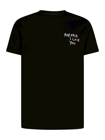 Ribbed crewneck; Short sleeves Contrasting "AMORE I LOVE YOU" embroidery at chest; Contrasting "DSQUARED2" lettering embroidered at back Straight hem Slim fit Black color 100% Cotton Made in Italy Item in photo corresponds to a M. Mannequin size: 48 IT. Mannequin measures: Height 1.85 cm, Bust/Breast 94cm, Waist 75cm, Shoulder 44cm, Neck 43cm, Hip Bone 93cm, Arm lenght 62cm, Breast level 26cm, Knee level 63cm, Wrist circumference 20cm