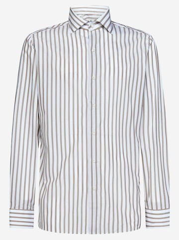 Front buttons closure Spread collar; Long sleeves, one-button cuffs Side slits Straight hem All-over beige vertical striped pattern Semi-slim fit Colour: white/beige 100% Cotton Made in Italy Item in photo corresponds to a 41 Neck. Mannequin size: 48 IT. Mannequin measures: Height 1.85 cm, Bust/Breast 94cm, Waist 75cm, Shoulder 44cm, Neck 43cm, Hip Bone 93cm, Arm lenght 62cm, Breast level 26cm, Knee level 63cm, Wrist circumference 20cm
