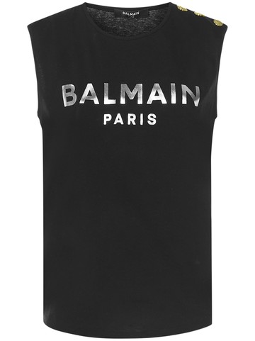 Crewneck; Sleeveless Embossed golden buttons on the left shoulder Silver logo printed on the front Rounded hem Regular fit Black color 100% Cotton Made in Portugal Item in photo corresponds to a S. Mannequin size: 42 IT. Mannequin measures: Height 1.75cm, Bust/Breast 85cm, Waist 65 cm, Shoulder 404 cm, Neck 36 cm, Arm lenght 57cm, Wrist circumference 16cm, Breast level 26cm, Knee level 66cm