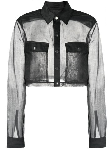 Camicia corta Lunghezza alla vita con vestibilità squadrata Apertura centrale frontale con chiusure a scatto a vista Colletto classico a camicia Cuciture laterali smussate, polsini con automatici e doppie impunture Tasche quadrate sul petto con patta smussata Cuciture originali sulle spalle e cinturino in tessuto di cotone con dettaglio rivetto sul carré posteriore Tessuto semitrasparente, che lascia intravedere la costruzione interna della giacca Colore: nero La modella indossa la taglia 40100% cotoneMade in Italy