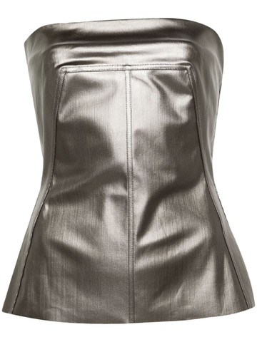 Top bustier Lido in denim stretch spalmato in gun metal Lunghezza ai fianchi con vestibilità aderente al corpo Il top bustier senza spalline presenta una caratteristica cucitura geografica che attraversa la parte anteriore del petto e si inclina diagonalmente lungo il corpo laterale Cerniera centrale posteriore e orlo a taglio vivo Il denim elasticizzato è ricoperto da un rivestimento semilucido e morbido La modella indossa la taglia 40 91% cotone, 6% elastomultiestere, 3% gomma Made in Italy