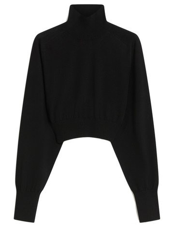 Maglia a lupetto in filato sottile di pura lanaPolsi, collo e fondo capo a costineFit morbidoLunghezza crop in vita e spalla alla francese caratterizzata da calature evidentiLe coste in vita creano un leggero sbuffo, più evidente al polso100% lana vergineMade in Italy