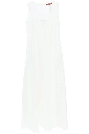 Abito lungo Max Mara Studio realizzato in ramiè con un taglio ampio e svasato. Modello smanicato con scollo tondo e punto vita arricciato sul retro. Sottoveste separata in viscosa tono su tono con spalline regolabili. La modella è alta 177 cm e indossa la taglia IT 38.