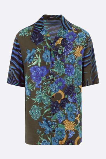 這款短袖鈕釦襯衫,以北歐色彩繽紛鮮豔的花卉圖案,搭配藍色背景,如同寶石與礦石般閃耀,散發出高雅時尚的氣息。