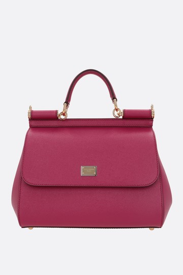 Dolce & Gabbana's top handle bag crafted in cyclamen pink Dauphine leather. Featuring gold-tone hardware, magnetic buttons closure on flap, top handle and adjustable / removable strap. Leopard print fabric-lined interior with zip / slip pockets and card slot. The design is completed by the unmistakable logoed metal plate and protective metal feet.