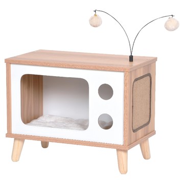 PetPals 無線貓窩基地台 獨特復古電視造型 提供安全舒適空間 頂部附逗貓玩具 木色 + 白色 1個 50.8 x 28 x 40.6cm