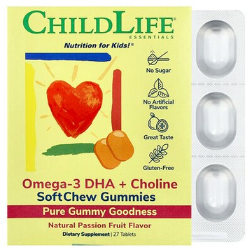 ChildLife Essentials, 必需,Omega-3 DHA+ 膽鹼咀嚼軟糖,西番蓮味,27 片