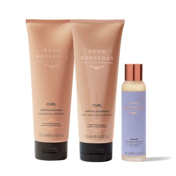 Deeply nourish your curls with the Grow Gorgeous Curl Duo alongside the Repair Heat Protection Leave-In Oil. The Curl Shampoo and Conditioner are formulated to enhance and define natural curls leaving them frizz-free, bouncy and healthy looking. The Repair Oil will enhance the nutrition brought by the duo while repairing damages and leaving a shiny finish. INTELLIGENT HAIRCARE INGREDIENTS: Curl technology provides long-lasting curl definition for smooth, manageable, bouncy curls Wheat Extract and Camellia Oil enhance and define natural curls by controlling volume and taming frizz Sweet Almond Oil nourishes curls without weighing them down Cocoa Butter nourishes, conditions and smooths curls for supple and silky soft looking hair Crambe Oil smooths, softens and nourishes curls to improve natural shine SKINCARE INGREDIENTS - NOURISH SCALP & ROOTS Oat Lipids Complex helps reinforce the scalp's natural protective barrier, helping to lock in moisture. OUR SIGNATURE 6-OIL BLEND Packed with a blend of 6 revitalizing oils to protect, nourish and add shine: Tung Wood helps to keep frizz under control and fight heat damage. Moringa Oil, deeply moisturises and detangles hair without weighing it down. Marula Oil, packed with anti-ageing amino acids, restores shine for silky smooth hair. Grapeseed Oil contains antioxidants for healthier-looking strands. Coconut Oil helps to smooth hair leaving it soft and shiny. Rapeseed Oil is rich in fatty acids, leaving hair feeling nourished. Hair Type: Curly, wavy or afro hair. Purely Positive Promise: Grow Gorgeous are proudly vegan friendly, gluten free and formulated without Parabens, Sulphates, Silicones, Phthalates or Mineral Oil. Volume: 2 x 250ml - 1 x 150ml