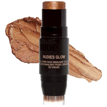 A skin brightening balm with a soft metallic glow for #glassyskin. Dab on highpoints of face for dewy highlight. Dual-ended blending brush twists off to wash. What it does: The perfect way to brighten your skin and lift the natural structure of your face, NUDIES GLOW All-Over Highlight reflects light to provide instant dewiness and luminosity. This skin-loving soft cream balm melts onto skin to look naturally glowing. Made in Korea innovation with a formula that provides youthful looking skin and a nude glow without shimmer or sparkle. Lightweight and luxurious formula for an ultimate glass-like glow.