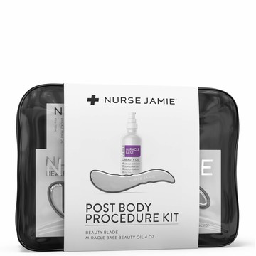 The Nurse Jamie Post Body Procedure Kit combines the Beauty Blade & Miracle Base Beauty Oil for the ultimate at-home beauty treatment. The Beauty Blade is a new custom designed deep massaging beauty tool. This unique beauty tool is designed with specialized curved edges to help massage most areas of the face and body. The scraping technique of the Beauty Blade helps to increase localized circulation to temporarily improve skin's overall appearance and glow. Nurse Jamie's Miracle Base Beauty Oil is made with 100% botanical oils, containing Arnica Montana Oil, Sunflower Oil and Prickly Pear Oil. This powerful blend was formulated to help hydrate, soothe and soften the skin. This especially concentrated blend is designed to answer specific issues such as crepey, dry or irritated skin, and inflammation.