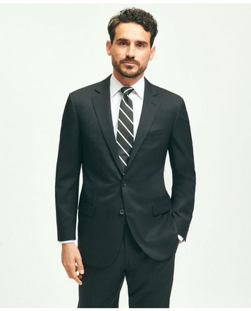 Made from the world's finest Italian-woven fabrics and internal canvas, and crafted in Italy, our flagship 1818 Suit Collection celebrates heritage made iconic. You'll feel the difference in hand-tailored arm openings for comfort, fully stitched craftsmanship that enhances longevity and framed interior pockets for your little necessities. Our wool features natural stretch that lets you move with ease, and our half-canvas construction conforms to your build. From the perfect lapel roll to a beautiful drape, you'll look your very best. TRADITIONAL FIT: Our most relaxed fit across chest, body and sleeves. (formerly known as Madison Fit)2-button closure; center vent; fully lined; flat-front trousers100% WoolDry CleanMade in ItalySuit comes with unfinished sleeves and trouser hems. Please visit your local store for alterations. Find a store | Brooks Brothers Men's Traditional Fit Wool 1818 Suit | Black | Size 44 Regular