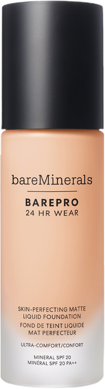 Why You'll Love bareMinerals BarePro 24HR Skin-Perfecting Matte Liquid Foundation SPF20: Full coverage but looks natural. Long-lasting formula stays put all day. Matte finish offers shine control. Skin-loving ingredients and breathable, weightless texture. Even's skin tone in just 7 days. SPF20 protection without a white cast or photo flashback. What bareMinerals Say: BARE YOUR BEST SKIN, 24/7! New BarePro 24HR Wear liquid foundation with a unique formula saturated with skin tone mimicking pigments, oil absorbing minerals, and skin-loving ingredients to provide breathable, undetectable, stay-true coverage. 24HR matte wear + 24HR comfort*. Formulated with brightening Pomegranate Peel Extract and Mineral-based Powders to even skin's tone in 7 days. Weightless on the skin, with no white cast, it contains Zinc Oxide to protect skin from damaging UVA, UVB, free-radicals + infrared sunlight with broad-spectrum SPF 20. Ideal for all skin types - even the most sensitive. Why It's Escentual: The original BarePro foundation first launched in 2017 and quickly became a favourite for those looking for a natural-looking matte foundation with skin-improving ingredients (a bareMinerals speciality). For 2024, bareMinerals has improved it! Changes include more skincare benefits, a lighter formula, eco-friendly packaging and our favourite update: more shades! The Best Way To Use It: Twist the pump to unlock and dispense the foundation. Apply by blending from the centre of the face outward with a makeup sponge or brush. Build coverage as needed. Values: Non-comedogenic. Vegan. Cyclic-silicone-free, Fragrance-free, Chemical screen-free, Oil-free, Gluten-free.