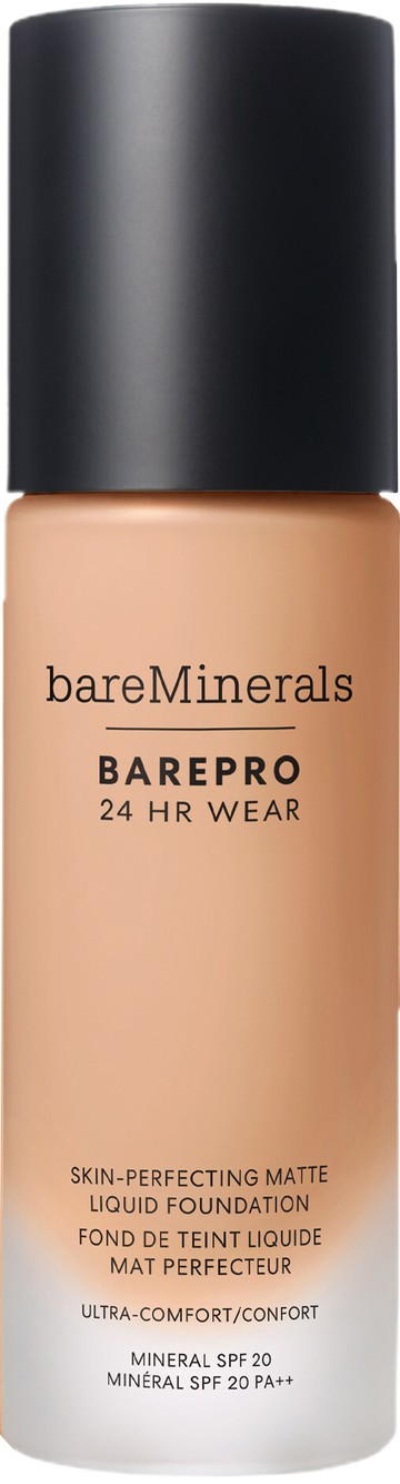 Why You'll Love bareMinerals BarePro 24HR Skin-Perfecting Matte Liquid Foundation SPF20: Full coverage but looks natural. Long-lasting formula stays put all day. Matte finish offers shine control. Skin-loving ingredients and breathable, weightless texture. Even's skin tone in just 7 days. SPF20 protection without a white cast or photo flashback.   What bareMinerals Say: BARE YOUR BEST SKIN, 24/7! New BarePro 24HR Wear liquid foundation with a unique formula saturated with skin tone mimicking pigments, oil absorbing minerals, and skin-loving ingredients to provide breathable, undetectable, stay-true coverage. 24HR matte wear + 24HR comfort*. Formulated with brightening Pomegranate Peel Extract and Mineral-based Powders to even skin's tone in 7 days. Weightless on the skin, with no white cast, it contains Zinc Oxide to protect skin from damaging UVA, UVB, free-radicals + infrared sunlight with broad-spectrum SPF 20. Ideal for all skin types - even the most sensitive.   Why It's Escentual: The original BarePro foundation first launched in 2017 and quickly became a favourite for those looking for a natural-looking matte foundation with skin-improving ingredients (a bareMinerals speciality). For 2024, bareMinerals has improved it! Changes include more skincare benefits, a lighter formula, eco-friendly packaging and our favourite update: more shades!   The Best Way To Use It: Twist the pump to unlock and dispense the foundation. Apply by blending from the centre of the face outward with a makeup sponge or brush. Build coverage as needed.   Values: Non-comedogenic. Vegan. Cyclic-silicone-free, Fragrance-free, Chemical screen-free, Oil-free, Gluten-free.