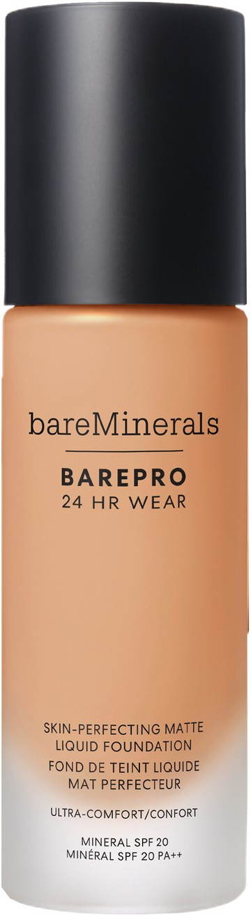 Why You'll Love bareMinerals BarePro 24HR Skin-Perfecting Matte Liquid Foundation SPF20: Full coverage but looks natural. Long-lasting formula stays put all day. Matte finish offers shine control. Skin-loving ingredients and breathable, weightless texture. Even's skin tone in just 7 days. SPF20 protection without a white cast or photo flashback. What bareMinerals Say: BARE YOUR BEST SKIN, 24/7! New BarePro 24HR Wear liquid foundation with a unique formula saturated with skin tone mimicking pigments, oil absorbing minerals, and skin-loving ingredients to provide breathable, undetectable, stay-true coverage. 24HR matte wear + 24HR comfort*. Formulated with brightening Pomegranate Peel Extract and Mineral-based Powders to even skin's tone in 7 days. Weightless on the skin, with no white cast, it contains Zinc Oxide to protect skin from damaging UVA, UVB, free-radicals + infrared sunlight with broad-spectrum SPF 20. Ideal for all skin types - even the most sensitive. Why It's Escentual: The original BarePro foundation first launched in 2017 and quickly became a favourite for those looking for a natural-looking matte foundation with skin-improving ingredients (a bareMinerals speciality). For 2024, bareMinerals has improved it! Changes include more skincare benefits, a lighter formula, eco-friendly packaging and our favourite update: more shades! The Best Way To Use It: Twist the pump to unlock and dispense the foundation. Apply by blending from the centre of the face outward with a makeup sponge or brush. Build coverage as needed. Values: Non-comedogenic. Vegan. Cyclic-silicone-free, Fragrance-free, Chemical screen-free, Oil-free, Gluten-free.
