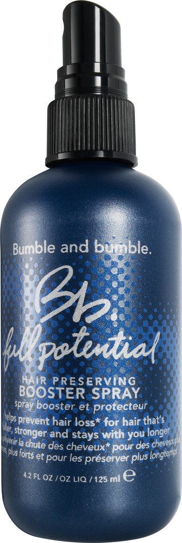Refortify and restore your hair's natural bounce with the Bumble Full Potential Booster Spray, a lightweight treatment that strengthens and nourishes your hair. This powerfully restorative spray works threefold to target breakage, limpness and thinning hair. It enriches each strand with the Hair Preserve Blend, a nutritious complex that maximises scalp health whilst adding body and volume to your locks. Suitable for those who want fuller and stronger hair, this transformative spray works to reduce breakage and thinning of the hair to give you the voluminous look you've been lusting over. For best results, wash your hair with the Bumble Full Potential Shampoo and Conditioner, then comb through wet or dry hair from roots to ends twice a day.