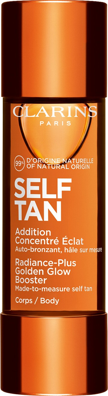''Keep your body golden and glowing with the Clarins Radiance-Plus Golden Glow Booster for Body, a self-tanning oil that you add to your body lotion to provide skin with radiant warmth from head-to-toe.'' - Caitlin, Escentual Beauty Team. Why you'll love Clarins Golden Glow Booster for Body: 99% natural self-tanning liquid drops that transform your usual body creams. Provides an even and natural-looking tan. Hydrates and moisturises skin while leaving a gradual and golden glow. Effortless and ultra-simple way to tan while you moisturise. Offers a long-lasting and enhanced bronzed warmth. Why it's Escentual: We know that tanning can sometimes feel like a long-winded chore, which is why we love the Clarins Radiance-Plus Golden Glow Booster body drops so much; they transform the process of tanning into a two-in-one pampering process. The Clarins tanning drops mean you can achieve a golden and long-lasting bronze tan as you moisturise your skin, meaning you don't need to add any extra steps to your current routine - instead, just add these drops to your cream! The lightweight oil has the Clarins [Self-Tan Complex] at its centre, which contains a duo of natural origin sugars - 100% natural DHA and erythrulose - which work together to give skin an enhanced bronzed radiance. Plus, skin is hydrated and moisturised as the oil also contains aloe vera and organic fig, which boosts skin hydration. The best way to use it: Apply 4 - 6 drops of the Clarins self-tanner oil to your favourite body cream in the palm of your hand, and apply evenly to the body. Wash your hands after applying and don't use the drops on their own. Values: Fragrance-free.