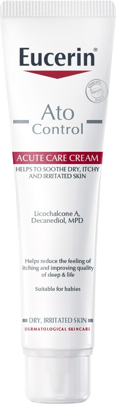 Relieve itchy and irritated atopic skin with the Eucerin AtoControl Acute Care Cream, a targeted cream specifically formulated to soothe and calm flare-ups and help to stop the urge to scratch for adults, children and babies over three months. Itchy, tight and uncomfortable skin can affect daily life as well as the ability to enjoy a good night's sleep. If you've ever tried to stop the itch-scratch cycle, you'll know how difficult it can be. The Eucerin Acute Care Cream is a welcome solution to atopic skin suffering from eczema or dermatitis where flare-ups are inevitable and it's a challenge to break the itch-scratch cycle. The formula boasts a unique active ingredient complex of calming licochalcone A, antibacterial decanediol (known to fight staphylococcus aureus - an important role in atopic dermatitis) and also cooling menthoxypropanediol to help alleviate itchiness instantly. Combined with moisturising and barrier-building ceramides as well as grape seed oil and evening primrose oil, skin is left feeling less dry and irritated. Why We Love It If you've ever experienced itchiness that causes overwhelming discomfort, you'll know how frustrating it can be not to have a solution. Some of our team suffer from eczema and found this cream to be effective at stopping the dreaded itch-scratch cycle that causes skin to look and feel worse. It's a great addition to have in your skincare collection if you suffer from flare-ups and the small nozzle makes it easy to apply to precise areas such as between the fingers that can often suffer during a flare-up. How To Use It Apply to flare-up areas as and when needed. Works Well With If you have atopic skin and you're looking for more ways to control and alleviate your flare-ups, take a look at the full Eucerin AtoControl range - specifically formulated for skin that is prone to irritation and dryness. Values Fragrance-free.