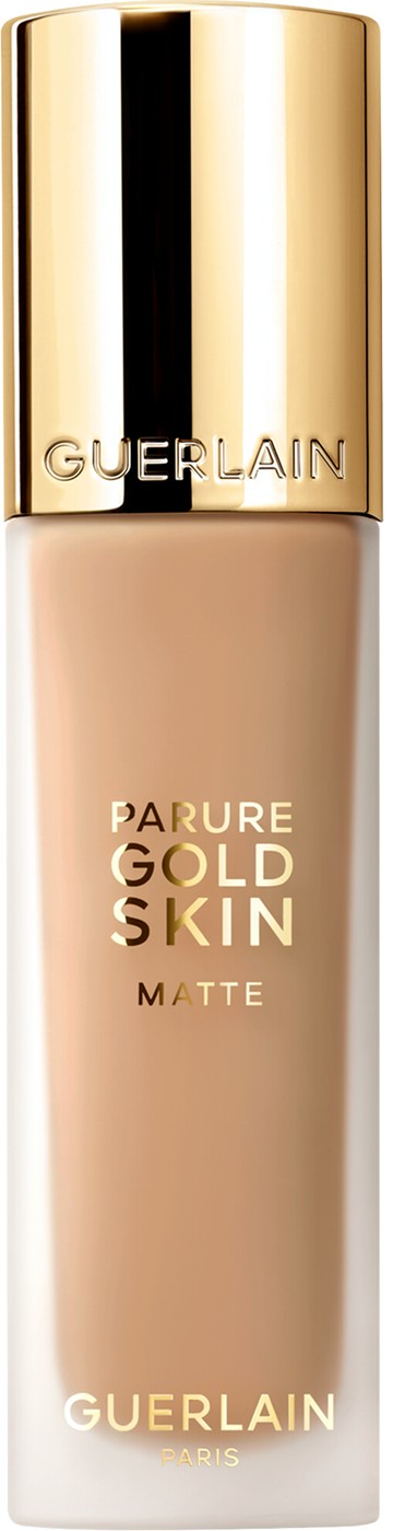 'It doesn't get more luxurious than GUERLAIN Parure Gold Skin Matte; infused with 24 karat gold, the matte foundation offers unparalleled luminosity while taking care of your skin with 85% skin-caring formula.' - Keavy, Escentual Beauty Team.   Why You'll Love The GUERLAIN Parure Gold Matte Foundation: Glowy matte finish that lasts 24 hours. Hydrates skin for 24 hours. Strengthens skin barrier with white peony. Protects skin from ageing using SPF15 or PA+++. A frosted glass bottle with a golden lid. Complexion is even by +15% while skin quality is improved by +13%. 18 adaptable shades for a variety of skin tones including cool, warm and neutral.   Why It's Escentual: Reformulated for 2022, the legendary Parure Gold Foundation has been reimagined and now is called GUERLAIN Parure Gold Skin Matte. For fans of the original, don't worry; the transfer-resistant formula is even more skincare while still maintaining the incredible lit-from-within glow that the original is so famous for. The finish is a little more matte than the old Parure Gold, with a lighter formula that feels more fluid than the previous edition. There is no doubt in our mind that Parure Gold Matte is one of the world's most luxurious foundations with a superior sensorial experience and a creamy formula with a subtle white floral scent. And, infused with real 24-karat gold, one of nature's true glow-givers, the radiance power inside can't be replicated. The bottle is bejewelled in frosted glass, topped with a golden lid and emblazoned with the signature double logo   The Best Way To Use It: Pump one to two times. Smooth over the complexion. For best results, use Parure Gold Kabuki Brush.   The Sustainable Side: The new version has a reduced glass weight for a bigger bottle with a 35 ml capacity. The bottle is made from recycled materials - 10% recycled glass (PCR) - and now even the pump is recyclable. You can also recycle the outer cardboard box.