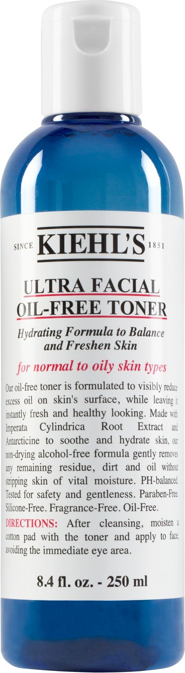 The skincare step your oily skin is missing, Kiehl's Ultra Facial Oil-Free Toner helps limit sebum secretions without drying out the skin. This innovative toner was created with the needs of oily and normal skin types in mind. Its lightweight and refreshing lotion texture gently removes a build-up of excess oil and the remnants of your cleanser, so your skin can maintain its natural radiance without being stripped of its protective layer. Is shine your skin's biggest bugbear? This daily toner will not only improve texture and mattify skin, but it'll also prepare your skin for your moisturiser, boosting the effects of your skincare routine. To keep your pores fresh and clean, the combination of a pH-balanced formula and an oil-banishing ingredient line-up of imperata cylindrica root extract and antarcticine is what makes this toner so effective. As this toner is alcohol-free, it won't dry your skin out. Its refreshing water-like texture soothes skin and contains high concentrations of potassium to create a long-lasting hydrating effect, whilst leaving your skin smooth, supple and ready for the next step in your routine. Why We Love It A signature step in the Ultra Facial Oil-Free regime, this daily toner assists with the texture of oily skin through the powers of hydration. The stand out ingredient in this formula is the Imperata Cylindrica Root Extract derived from the Australian outback. Known for its ability to survive in the driest weather, its hydration-preserving capabilities will do wonders for skin that needs an extra bit of TLC after the cleansing phase of your routine. How To Use It The Ultra Facial Oil-Free Toner can be used twice daily. After cleansing, dampen a cotton pad with the formula and wipe over your skin avoiding the eye area. To complete your routine, follow with the Ultra Facial Oil-Free Lotion; this moisturiser won't overburden your skin, it will simply hydrate and soothe. Works Well With To keep your skin shine-free and optimally hydrated, we highly recommend that you try the Kiehl's Ultra Facial Oil-Free Collection. Values pH-balanced and tested for safety and gentleness. Oil free, fragrance free, alcohol free, paraben free, silicone free.