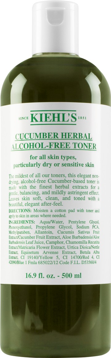 Step up your skincare routine with the Kiehl's Cucumber Herbal Alcohol-Free Toner and achieve beautiful clarity for dry and sensitive skin. Ultra-mild and designed to leave your complexion feeling fresh and clear, this fast-working toner knows what it's doing! Its famously refreshing formula is infused with naturally-derived herbal extracts to give your skin the very best, with a mild astringent effect that will tone without leaving your skin feeling dry. Did you know that this formula was first conceived in the late 1960s? It's been a firm favourite of Kiehl's customers ever since. Why We Love It Dry, sensitive and stressed out skin need to try this - it makes complexions feel as cool as a cucumber! The mildest toner that Kiehl's offers, its soothing formula is just perfect for introducing some freshness into your routine. How To Use It To use, simply apply a generous amount onto a cotton wool pad, glide over your face and let your Cucumber Herbal Toner do the rest. Top Tip: If your skin is in need of a little extra, apply your Kiehl's Cucumber Herbal Alcohol-Free Toner morning and night for a moisture surge that will leave your skin feeling hydrated and fresh as a daisy. Works Well With Now your skin is perfectly toned, what about a layer of fresh hydration? The Kiehl's moisturisers collection has a texture and formula for all skin types and needs. Values Alcohol-free.