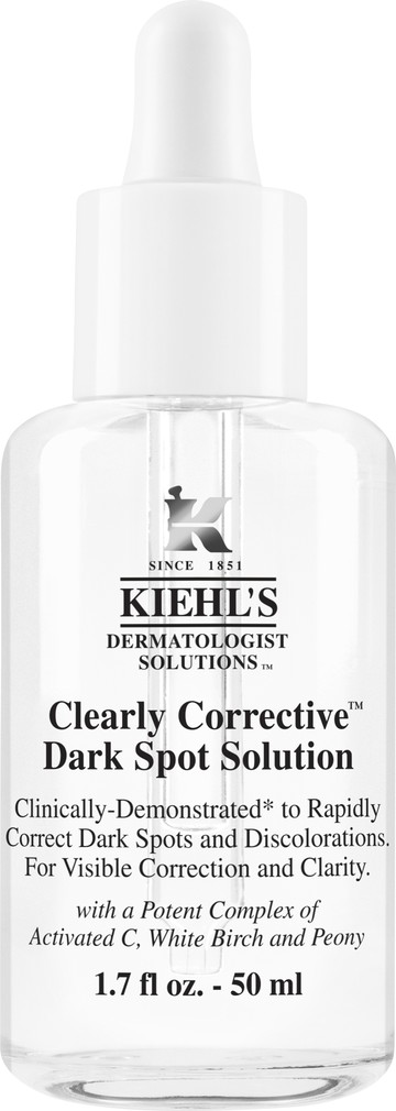 Is your hyperpigmented skin in need of a helping hand? Look no further as the Kiehl's Clearly Corrective Dark Spot Solution will promote youthful clarity and a more even complexion. Created to both help to reduce the appearance of existing dark spots and assist with the prevention of the appearance of further hyperpigmentation in the future, this transparent concentrate is an all-in-one solution to your pigmentation concerns. Its potent blend offers the highest concentration of intensely brightening activated C (a derivative of vitamin C), white birch and peony in the Clearly Corrective range. Kind to all skin styles but effective on dark spots, it's a daily essential for those with uneven skin. Why We Love It This serum does it all; helps to reduce the appearance of dark spots, discoloration and hyper- pigmentation whilst evening and illuminating your skin's complexion. It's a sure fire way to complexion success. How To Use It Dispense a small amount into your hand, and massage all over your face and neck both morning and evening, being mindful to avoid the eye area. During the day, follow with an appropriate SPF. Top Tip: If you don't need to apply to the entire face, apply directly to areas of hyperpigmentation. Works Well With Follow up your treatment with a daily SPF from for the face from the Kiehl's suncare collection. Values Silicone-free, paraben-free, fragrance-free.