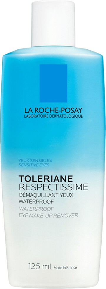 Remove every last trace of eye makeup with the La Roche-Posay Toleriane Respectissime Waterproof Eye Make-Up Remover, created especially for sensitive eyes. Formulated with a gentle touch, the Toleriane Respectissime Waterproof Eye Make-Up Remover suits the specific needs of sensitive eyes and contact lens wearers. Its bi-phase formula respects the tolerance of skin, whilst providing powerful removal action. In a flash, the Waterproof Eye Make-Up Remover removes even waterproof eye makeup without rubbing or tugging at the eye, ensuring the eye contour is left thoroughly cleansed and free from redness and irritation. Its strict formulation charter minimises the risk of intolerance, ensuring the skin around the eye area is not damaged. Shake well before use and apply using a cotton pad. Repeat until the cotton pads come away free from makeup. Rinse the eye contour to remove any residue. Paraben-free, high tolerance, fragrance-free.