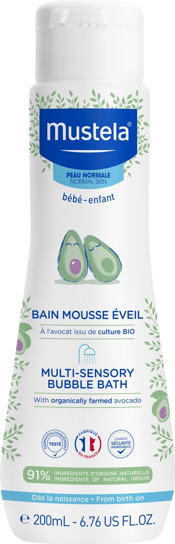 Create a sensory cleansing experience for your little one with the Mustela Multi Sensory Bubble Bath for normal skin types. Suitable for use from birth, Mustela's soap-free Multi Sensory Bubble Bath effectively cleanses your infant, while releasing a delicate scent that soothes and stimulates your baby's senses. Featuring mild surfactants to offer an effective cleanse without drying the skin, the foaming, tear-free formula blends 88% natural ingredients to care for your little one. Enriched with Avocado Perseose®, the formula actively protects the skin's barrier, while preserving the skin's stem cell supply. Plus, your child's skin is left feeling instantly soft and hydrated, thanks to natural cornflower extract and marine trace elements, which maintain the skin's water balance. Proven to leave your child's skin clean, clear and soft, this wash also lightly fragrances the skin, which adds to the ultra-relaxing bathing experience. Why We Love It The first few weeks and months of your infant's life are really unique and exciting for parents, as you get to see your little one explore and experience many things for the first time. We love how Mustela has replicated this experience in this sensory, blue-tinted bubble bath, by allowing your cherub to enjoy a light foamy texture and soothing scent - which also contributes to their well-being. Plus - with full-sized and travel-sized editions of Mustela's Multi Sensory Bubble Bath, you can protect, cleanse and nourish the delicate skin of your child wherever you are. How To Use It Pour a small amount into the tub while the water is running to create a smooth silky foam. After use, rinse the bubble bath off your baby's body with lukewarm water and dry. Works Well With It's always a great idea to moisturise your little one after bathtime, to keep their delicate skin hydrated and soothed. So, take a look at Mustela's impressive range of products for normal skin to find the best formula for your baby or child. Values High tolerance, hypoallergenic and dermatologically-tested. Soap-free, paraben-free, phthalate-free and phenoxyethanol-free.