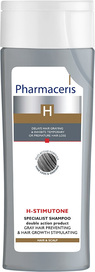 ''Give grey hair a colour boost with the Stimutone Double Action Specialist Shampoo, a dermatologically-tested hair wash to improve pigment in dull and thin hair.'' - Darcey, Escentual Beauty Team. Why you'll love Pharmaceris Shampoo For Grey Hair: Delays hair greying and prevents hair-loss. Restores natural hair colour without dyes. Gently cleanses whilst strengthening hair. Suitable for sensitive scalps. SLS-free and SLES-free. What You Need To Know: The H-Stimutone Shampoo gently cleanses the scalp, whilst improving the hair condition through its scientifically developed formula. Enriched with naringenin, this gel texture slows down hair ageing and restores natural pigmentation, the combination of nut extract and caffeine gradually darkens and strengthens the hair to reduce thinning or loss, not to mention the nuts add a luxurious golden colour to the gel. The dermatologically-approved formula is both SLS and SLES-free allowing you to deeply cleanse your scalp well soothing any irritation - this hair wash is ideal for sensitive scalps and daily-use. Why it's Escentual: Developed as part of a science centre research project this hair wash utilises innovative ingredients to provide efficient solutions to grey, sparse hair. The golden brown gel is ideal for ageing, greying hair prone to thinning and is perfect for anyone who wishes to tackle their greys without using dyes. The double nature of the shampoo cuts down shower time and avoids an extensive hair care routine. We love that this shampoo leaves behind a subtle sweet fragrance for a feeling of all-day cleanliness. The Best Way To Use It: Use the Stimutone shampoo at least 3 times a week by applying onto wet hair and gently rubbing it in for 2-3 minutes, ensuring to rinse the formula out with water. Values: Dermatologically-tested. SLS-free, SLES-free.