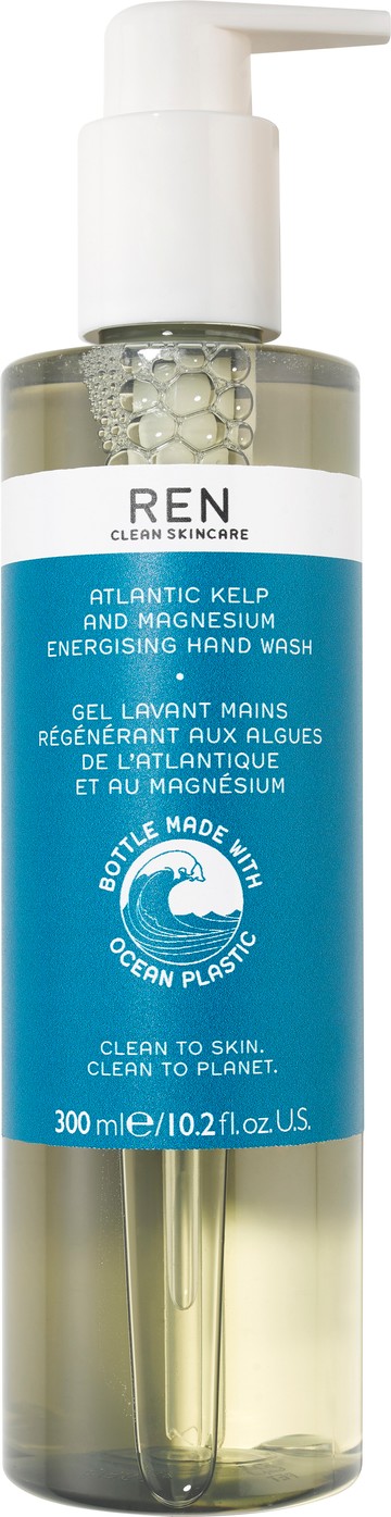'Gently cleanse your hard-working, tired hands with the REN Atlantic Kelp And Magnesium Energising Hand Wash, an uplifting, vegan-friendly complex that leaves your hands supple, nourished and soothed.' - Darcey, Escentual Beauty Team. Why You'll Love The REN Atlantic Kelp and Magnesium Hand Wash: Gentle, daily hand wash that doesn't cause dryness, irritation or discomfort. Leaves hands supple, nourishes and soothed. Perfect for hard-working or frequently washed hands. Uplifting and energising scent. Vegan, PETA-approved cruelty-free formula. 100% recyclable and recycled plastic design with a spring-free pump. What You Need To Know: Perfect for hard-working and tired hands, the REN Atlantic Kelp and Magnesium Hand Wash works to moisturise and revive whilst gently cleansing your skin. Packed full of essential minerals and oils, the Energising Hand Wash boasts sustainably sourced Magenisum PCA and nutritious Atlantic Kelp to leave your hands supple, nourished and soothed. The unique blend of bioactives protect and moisturise your skin to prevent dryness and irritation. Infused with an anti-fatigue fragrance, the REN Energising Wash coats your hands with an uplifting spa-like scent. The natural cleansing agents wash away any dirt and impurities without drying out your skin - it's ideal for anyone who has to wash their hands frequently. Why It's Escentual: Did you know that 8 million tonnes of plastic enter the ocean each year? That's why we love REN's commitment to the planet with the Atlantic Kelp and Magnesium Hand Wash's vegan and PETA approved cruelty-free formula that's housed within a 100% recycled and recyclable plastic bottle design. Not to mention, it's super easy to use with a lockable pump for mess-free application . A perfect pairing for the Atlantic Kelp and Magnesium Hand Lotion, the duo offers a well-rounded solution to dry, uncomfortable and tired hands. Ideal for new mum's, the Energising Hand Wash provides an uplifting and energising aromatic boost whilst efficiently cleansing your skin without triggering discomfort or tightness. The Best Way To Use It: For best results, pump the Energising Hand Wash onto wet hands and create a lather. Wash your hands for at least 40-60 seconds before rinsing thoroughly and patting dry. To open your Hand Wash turn the pump right, and to lock, turn left. The Sustainable Side: The REN Atlantic Kelp and Magnesium Hand Wash has been designed with our oceans in mind. Housed within a 100% recycled plastic packaging, including an innovative spring-free pump, the Energising Hand Wash contains 20% recycled ocean plastic sourced from oceans, beaches, rivers, lakes and banks of waterways. Values: Vegan. PETA Approved Cruelty-free. Nut-free, Gluten-free.