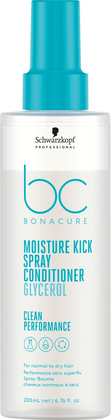 'Looking to hydrate, smooth and protect your hair in seconds? Look no further than the Schwarzkopf Professional BC Bonacure Moisture Kick Spray Conditioner - it adds a weightless layer of hydration in a matter of moments.' - Kate, Escentual Beauty Team. Why You'll Love The Schwarzkopf Professional Moisture Kick Spray Conditioner: Leave-in spray conditioner for dry, brittle, porous or textured hair. Features a vegan formula to detangle and hydrate normal to dry hair. Leaves lightweight hydration with improved hair elasticity. Delivers a smooth, healthy-looking shine. Provides heat protection during hairstyling. Part of the Moisture Kick hair care routine. What You Need To Know: Specially formulated to condition and hydrate your tresses in seconds, the Moisture Kick leave-in conditioner helps your hair maintain its optimal moisture level. Offering a lightweight hydrated feeling that lasts up to 48 hours, the spray is great to use on tangled tresses as it helps smooth and detangle for healthy-looking hair with improved elasticity and manageability. Following its 2022 reformulation, the Schwarzkopf Professional Moisture Kick Spray Conditioner is now powered by advanced technology featuring a Vegan Care Complex + Glycerol. Glycerol provides long-lasting balanced hydration to the scalp and hair, while smoothing the hair's surface and preventing dehydration. In addition, the spray delivers supple softness, bounce and shine to each strand using innovative Vegan Keratin and Cell Equaliser Technology. Why It's Escentual: We love that BC Bonacure Moisture Kick range - including the no-rinse spray conditioner - has undergone an eco-conscious reformulation to make it cleaner than ever. It's now powered by innovative vegan active ingredients and cutting-edge technologies that have cut out lots of preservatives - like parabens - all without compromising on the efficacy of the formula. Yep, you heard that right - it's just as good as before the reformulation, if not better! Although anyone with hair that needs a moisture boost can benefit from the sweetly scented Bonacure Moisture Kick Spray Conditioner, Schwarzkopf's leave-in conditioner is particularly great for those with curly hair. It really helps to moisturise, refresh and define your curls. And of course, we love how quick and effective it is to use this ultra-fine, invisible leave-in conditioner - just spritz and style! . The Best Way To Use It: Shake well and apply in sections to towel-dried hair. You'll need an average of 8-10 spritzes per use. Do not rinse out, and style as usual. The Sustainable Side: The spray is held in a 100% recycled and recyclable plastic bottle. Values: Vegan. Silicone-free, sulphate-free, paraben-free, mineral oil-free, microplastic-free, artificial colourant-free.
