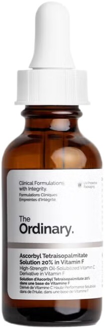 Achieve radiant and hydrated skin with The Ordinary Ascorbyl Tetraisopalmitate Solution 20% in Vitamin F, a high potency vitamin c oil that helps to fight signs of ageing for a youthful, glowing and protected complexion. The Ordinary Ascorbyl Tetraisopalmitate Solution 20% is a lightweight serum infused with an oil-soluble derivative of the skin-brightening vitamin c, combined with a moisturising essential fatty acid vitamin f. Vitamin c brightens the skin by inhibiting melanin production and boosts collagen, which is essential for firmer, youthful skin. It also offers incredible antioxidant protection, which shields skin from damaging effect of free radicals, such as pollution, UV rays and cigarette smoke. The vitamin f ingredient is an essential fatty acid that is crucial for maintaining the skin's outer layer. It fortifies and protects skin without weighing it down, and provides moisture and plumpness to ensure your complexion is hydrated as well as radiant. Why We Love It The infusion of Ascorbyl Tetraisopalmitate with hydrating vitamin f in this clear oil-based formula makes it a perfect serum for dry or dehydrated skin types. Any The Ordinary who finds the pure L-Ascorbic Acid formulas too strong, this offers weaker potency that is extremely effective - so this may be a good alternative! Vitamin c is notorious for being unstable, but this formula is protected at all times thanks to The Ordinary's UV-protective protective bottle; so, the formula's high vitamin c concentration will stay at its maximum potency with every use. How To Use It Use the pipette to dispense a few drops onto your clean face and then massage into the skin. Apply daily in the morning and evenings, and then follow up with your favourite moisturiser. Works Well With Love the results you get from Vitamin C? Explore The Ordinary's entire collection, which infuses a variety derivatives of Vitamin C in different formats. Values Vegan. Water-free, alcohol-free, silicone-free, nut-free, gluten-free, cruelty-free.