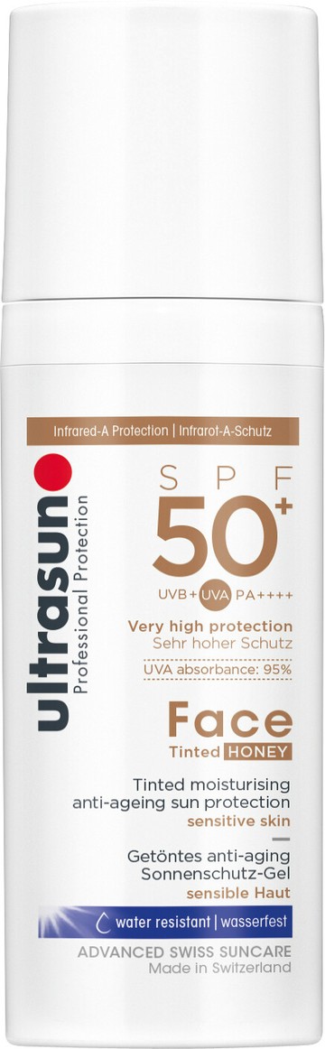 Achieve a bronzed, unified and protected complexion with the Ultrasun Tinted Face Anti-Ageing Formula SPF 50+ in Honey, a very high protection tinted daily SPF moisturiser for sensitive skin. Packed with innovative suncare complexes, the Ultrasun Tinted Face Formula will protect your face from the damaging effects of the sun by offering broad-spectrum defence while enveloping it in a sheer natural warm hue. The water-resistant formula absorbs 95% of UVA rays and targets UVB rays with SPF 50+ protection. Titanium dioxide creates an invisible shield against blue light (HEV) while GSP fends off infrared rays for an optimally protected complexion. Harnessing their suncare expertise, Ultrasun has used their iconic lamellar technology. This binds the sunscreen to the skin for all-day protection that'll help fend off prickly heat and keep sun allergies at bay. Not only does the tinted SPF defend against UV rays, it also hydrates the skin while protecting it against premature ageing. Featuring an active enzyme, ectoin, the facial sunscreen smooths away fine lines and wrinkles while reducing the appearance of larger pores. This natural ingredient helps to boost the cell's renewal process for a younger and refreshed appearance while maintaining an optimum moisture level for healthy and hydrated skin. Why We Love It We love a multi-tasker; we especially love anything that makes daily suncare that little bit easier. The Ultrasun Tinted Face Formula ticks all of the boxes: it's an SPF, it's a moisturiser and it provides a subtle coverage. Say goodbye to packing three products in your travel bag as this one product does it all. You'll never forget your daily SPF again once you've tried this multi-tasking masterpiece. The SPF 50 sunscreen is weightless and comfortable on the skin. It blends in seamlessly and is absorbed instantly by skin with a velvety light skin feeling. Perfect for days you want a 'no-makeup' appearance, the tinted moisturiser provides a flawless and even finish that's encompassed in a suncare shield and simply glows with health. How To Use It Massage over cleansed and dry face, neck and decollete 30 minutes before sun exposure. Works Well With If you want to achieve the same unified, healthy glow all-over while keeping your body optimally protected from UV rays then make sure you pair this hardworking face cream with a suncare product from Ultrasun's Tinted Body range. Values Vegan, non-comedogenic. Fragrance-free, emulsifier-free, paraben-free, mineral oil-free, silicone-free.
