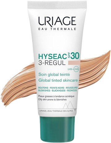 Defend your problematic skin from breakouts and the sun with the Uriage Hyseac 3-Regul Global Tinted Skincare SPF 30, an oil-free tinted daily moisturiser for combination, oily and sensitive skin. The daily face cream offers SPF 30 protection from damaging UVA and UVB rays while inhibiting blemishes, blackouts and oiliness. The moisturiser helps to eliminate spots and skin imperfections and contains a trio of patents to prevent blemishes from reappearing. A liquorice blend reduces excess sebum for a long-lasting smooth and matte appearance. The sun filters work to protect the complexion while also limiting the rebound effect of acne and the appearance of sun-induced marks. Skin is unified and mattified as the tinted high coverage formula subtly conceals spots and imperfections for an even complexion. The cream leaves a non-greasy, powdery finish with an anti-shine effect and a universal and blendable tone. The hypoallergenic moisturiser also contains Uriage's renowned Thermal Water from the French Alps. This naturally healing and soothing water helps to hydrate skin and infuse it with a plethora of minerals and vitamins. Why We Love It We're passionate about many things - two of which are sun care and multi-tasking products. The Hyseac moisturiser ticks both of these boxes as it makes it effortless to remember to wear your daily SPF. While it's protecting your skin, it's also hard at work nourishing it and ridding it of pesky spots, blemishes and blackheads. The weightless texture that absorbs instantly coupled with the fruity-floral scent makes this SPF 30 moisturiser a treat to use. It leaves an airbrushed and fresh-faced finish, perfect for when you want a unified and shine-free appearance without makeup. The lotion is held in a white tube with a lime-green lid and a cannula tube nozzle for effortless application. It can easily be popped in your handbag or travel bag, allowing for SPF protection on-the-go and anti-spot treatment wherever you are. How To Use It Use daily. Apply every morning to a thoroughly cleansed, dry face. Works Well With Say goodbye to breakouts and oiliness by ensuring you complete your skincare routine by exploring the full Uriage Hyseac range. Values Hypoallergenic, non-comedogenic. Oil-free.
