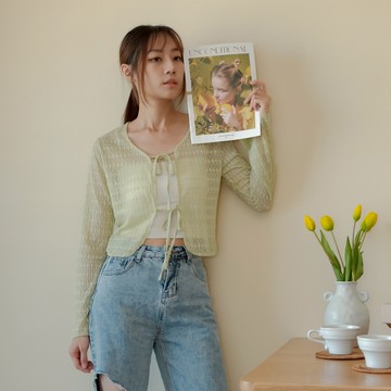 【Our Studio】溫柔蕾絲前綁帶薄外套 白色 杏色 嬰兒藍色 奶油粉色 酪梨綠色(現貨)