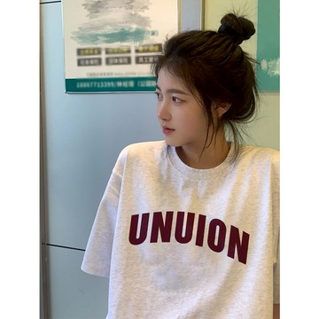 灰色正肩短袖美式復古t恤女小個子夏季2025新款字母印花體恤上衣