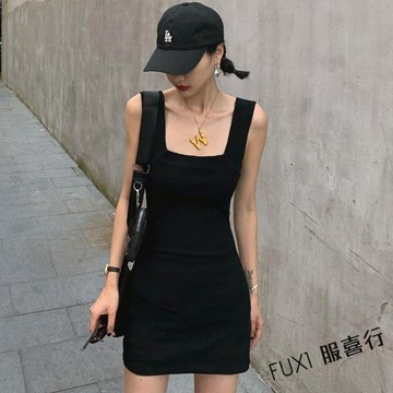 FUXI 洋裝 無袖洋裝 針織連身裙 性感窄裙 寬肩帶背心裙 遮副乳 短裙 吊帶裙 外穿 百搭 修身 包臀裙
