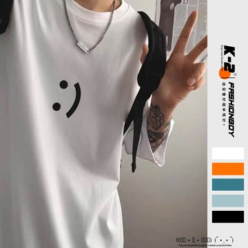 【K-2】韓國 表情符號 微笑 情侶穿搭 簡約 潮流 短袖上衣 寬鬆 落肩 個性 百搭 男女不拘【BB6287】