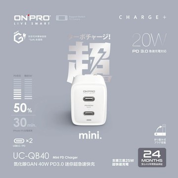 ONPRO UC-QB40 GAN 40W氮化鎵超急速充電器【雙Type-C版】