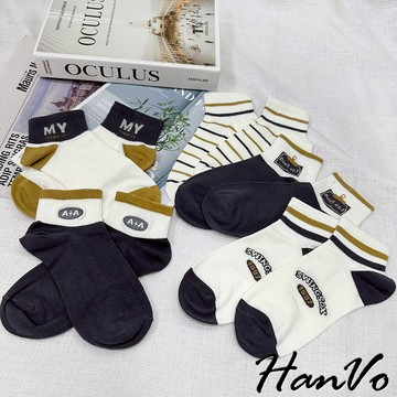 【HanVo】男款黃灰撞色字母短襪 透氣吸濕排汗 韓國流行百搭休閒襪 潮流簡約休閒短襪 男生配件 B07-7022