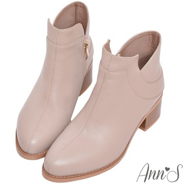 Ann’S諾拉-雙弧線V口顯瘦真皮小羊皮粗跟短靴5cm-杏