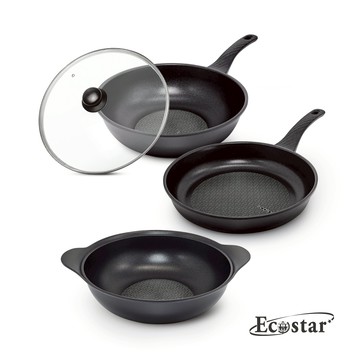 【韓國ECOSTAR】黑鈦鑽石不沾鍋具組(28炒+28平+28湯+28蓋)/瓦斯爐/IH電磁爐