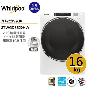 立刻下載Whirlpool惠而浦 8TWGD8620HW (桶裝)瓦斯型滾筒乾衣機 16公斤【拆封福利品】