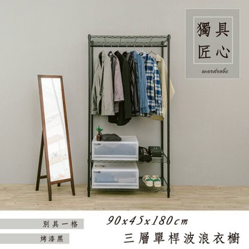 比架王 輕型90x45x180cm三層單桿衣櫥層架(烤漆黑) 鐵力士架 波浪架 衣物收納 換季 收納衣架
