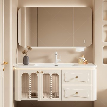 點我下載谷天GU TIN 浴櫃 奶油風烤漆洗漱臺橡木浴室櫃組合圓角陶瓷一體盆智能洗手洗臉盆櫃 浴室櫃