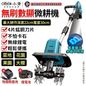 【Ogula小倉】無刷微耕機 鬆土機 翻土機 4片錳鋼刀-電量顯示 電動翻土機 手持微型耕機 農用翻土機 電動挖土旋耕機