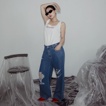 【PolyLulu】 萊賽爾個性刷破牛仔寬褲 MUA! 中大尺碼褲子
