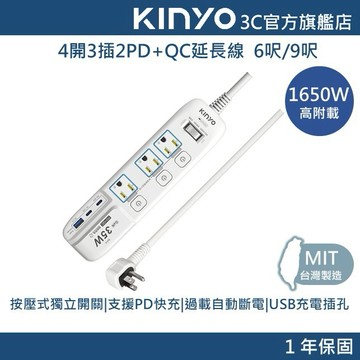 【KINYO官方直營】4開3插2PD+QC延長線 6呎/9呎 (GIPD)